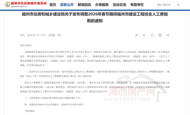 海西房产网(微信号:fjhxfcw)动静:2月12日,福州市住房和城乡扶植局下发“关于发布调整2026年春节期间福州市扶植工程分析人工费指数的通知”。为激励我市各扶植项目正在2026年春节期间不断工及节后早复工稳出产,保障项目合理计价,建建工人权益,《福建省扶植工程人工费动态办理法子》(闽建建〔2017〕38号)、《关于人工费动态调整相关事项的通知》(闽建建〔2018〕28号)等文件,我局连系建建市场人工费变化环境,调整2026年春节期间福州市扶植工程分析人工费指数,相关事项通知如下:一、2026年2月15日至2026年3月3日,按1。3886计取。分析人工费指数取《福建省建建安拆工程费用定额》(2017版)、现行各专业工程预算定额(耗损量定额)及《福建省衡宇建建和市政根本设备工程施工机械台班费用定额》(2021版)配套利用,同时合用于采用人工预算单价计价的工程。塔式起沉机的人工费按照《福建省住房和城乡扶植厅关于调整建建施工塔式起沉机人工费计价体例的通知》(闽建建〔2018〕17号)以消息价计价。