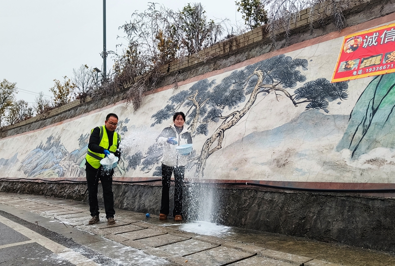2026年1月21日,贵州省毕节市纳雍县勺窝镇务井村山王庙路段,纳雍县交通运输局农村公路养护核心工做人员正在撒盐除冰。
