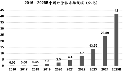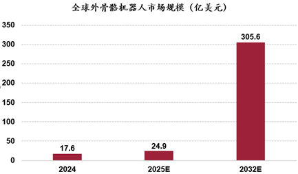 全球外骨骼机械人市场规模快速增加,比来七年CAGR超 40%,C端市场空间广漠。按照Fortune Business Insights于2025年5月发布的数据,2024年全球可穿戴外骨骼机械人市场规模为17。6亿美元,2025-2032 年估计市场规模将从24。9亿美元增加至305。6亿美元,预测期内复合年增加率达到43。1% 。按照迈步机械人官网数据,中国外骨骼机械人市场规模从 2016年的0。03 亿元增加至2021年的4。4亿元,年复合增加率为171。19%。跟着外骨骼机械人产物机能的提拔和下逛医疗需求的增加,估计 2025 年我国外骨骼机械人市场规模将达 42 亿元。