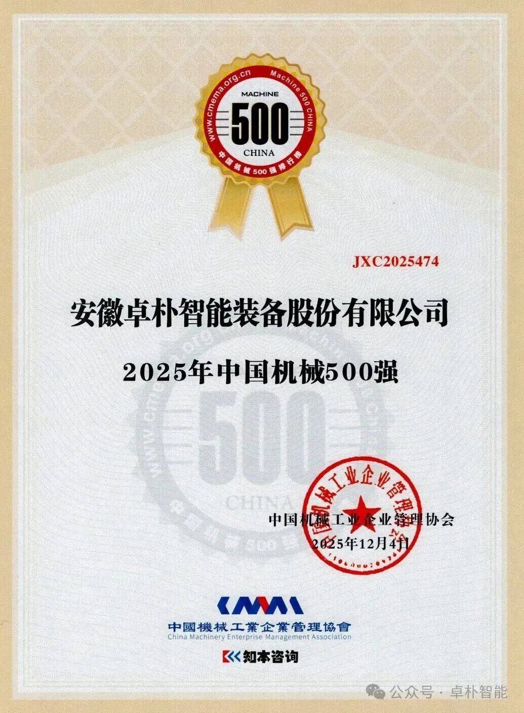 2026郑州机床展:卓朴智能荣登2025中国机械500强榜