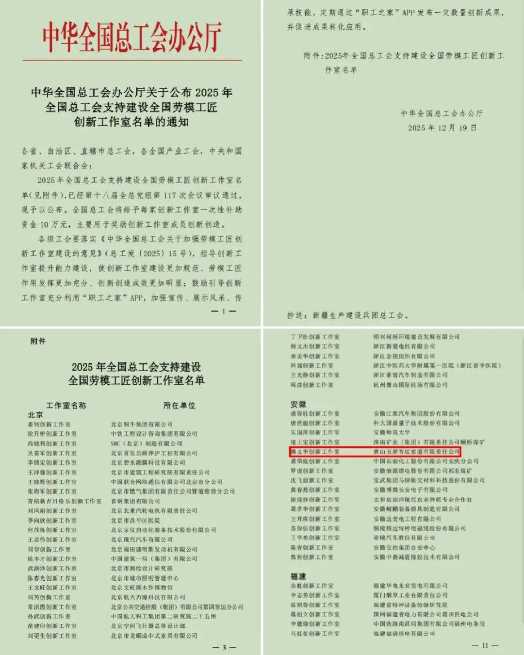近日,由黄山市总工会保举、黄山玉屏客运索道无限义务公司依托扶植的姚文华劳模立异工做室,成功入选2025年全国劳模工匠立异工做室,系该年度黄山市独一入选单元。这一荣誉标记着该工做室正在索道运维手艺立异、人才培育及行业示范引领等方面的凸起成绩获得国度层面承认。